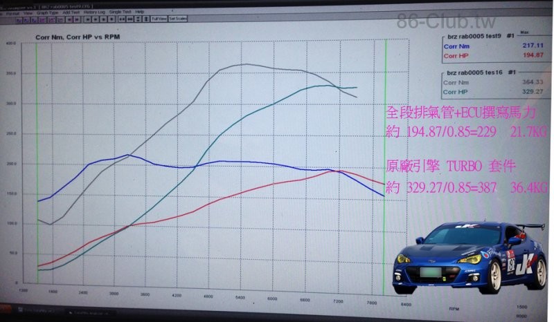 本公司 BRZ TURBO 淨馬力397 匹 扭力36.4KG 達成..(耗損0.83)